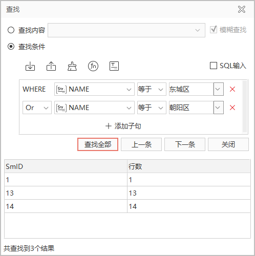 属性表中的查找功能用来查找当前打开的属性表中符合查找条件的记录,提供查找内容、查找条件两种方式,其中查找条件还提供半自动SQL语句输入和SQL手动输入两种模式。