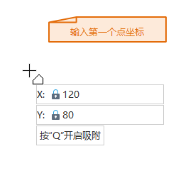 - 移动鼠标,可以看到随着鼠标的移动,在地图窗口中会实时显示鼠标位置与上一个控制点连线的长度及其与 X 轴正向之间的夹角,在参数输入框中键入长度值和角度值(可以通过按 Tab 键,在两个参数输入框间切换),按 Enter 键执行输入,确定多边形的第一段线的绘制。