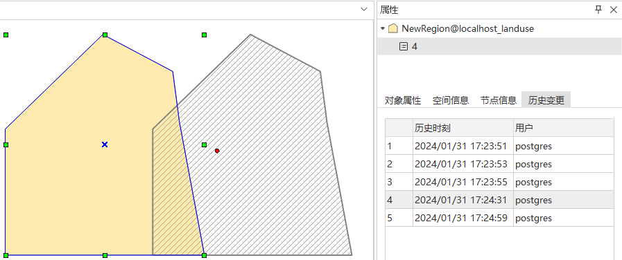 - 在地图窗口中选择编辑过的对象,并在其右键菜单中选择属性项,即可在对象属性面板的历史变更项中查看变更记录,变更记录列表中包含历史时刻信息与用户信息。