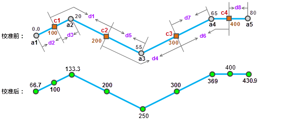 - 对于节点a1,使用c1和c2来校准。首先计算c1与c2之间的距离d1,然后计算出校准率R1=d1/(200-100)。注意这里提到的距离都是指沿线距离。