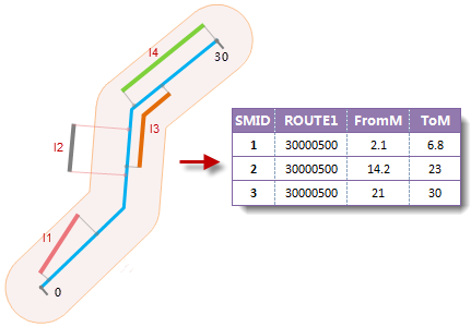与点事件表达生成类似,如果线对象完全落入查找范围内,则每条线会生成一个线事件,属性字段包含了路由标识 ID、线起点的刻度值和线终点的刻度值。未落入或者部分落入查找范围的线对象不会生成线事件。下图是生成线事件表的示意图,线L2到路由的最大直线距离大于查找半径,因此不会生成对应的事件。