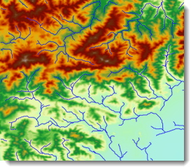 水系矢量化功能用来将栅格水系转化为矢量水系,并将河流的等级存储到结果数据集的属性表中。得到矢量水系后,就可以进行各种基于矢量的计算、处理和空间分析,如构建水系网络。下图为 DEM 数据以及对应的矢量水系。