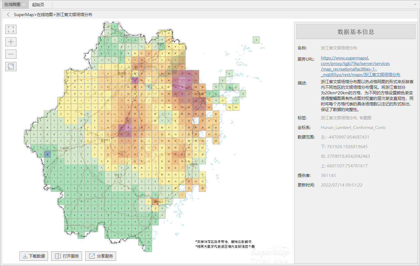 - 地图预览:单击地图列表中的某一地图,可在当前窗口中预览该地图,地图预览支持放大、缩小、全幅显示等操作。浏览在线地图的同时,地图右侧可查看该地图的名称、详细描述、服务URL、坐标系、数据范围、提供者、更新时间等信息,如下图所示: