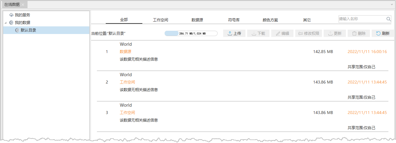 我的数据中的数据即为用户上传至个人账户的工作空间、数据源、符号库、颜色方案等数据。
