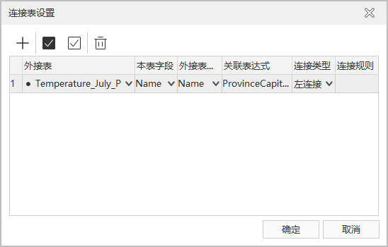 6. 连接表设置对话框中将本表字段外接表字段都设置为Name连接方式左连接,单击确认按钮。