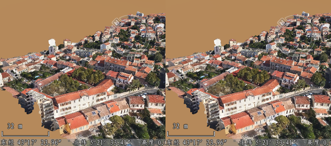 - 在贴地模式下,线图层、面图层、栅格图层、影像图层、线或面生成的场景缓存(*.scv)图层、影像缓存(*.sci、*.sit)图层、地图缓存(*.sci)图层,在分屏显示时,其他窗口显示的图层与第一视口显示一致: