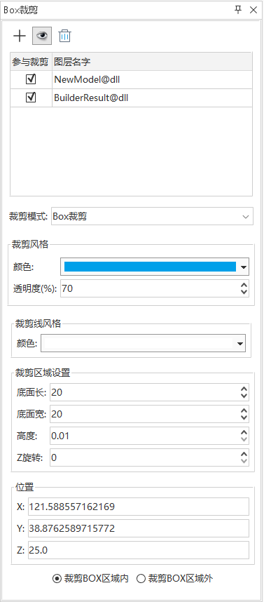 按钮,在场景中绘制一个四边形区域,系统会自动生成一个以此区域为基准的Box。生成的Box的大小可以通过输入长、宽、高、Z轴旋转角度值进行调整,其位置信息可输入X、Y、Z值进行调整。在“裁剪区域设置”参数和“位置”参数处进行修改。如下图中所示。 - 单击工具栏中"可见"