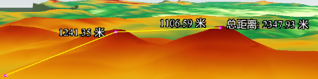 “依地距离”:在场景中的地形之上进行距离量算,该功能可以根据地形自动附着在地表之上计算出地表起伏的曲面距离。