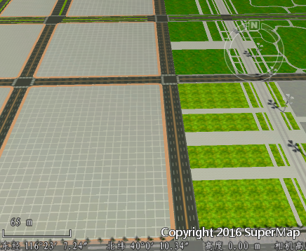 例如,在地上场景浏览时,也需要看到浏览区域内地下管线的铺设情况,就可以对道路图层设置卷帘,同时开启地下,设置地下透明度,就能在浏览时达到想要的效果。如下图中所示,就是对道路图层设置了卷帘区域,并开启地下、设置透明度为100%(全透明),而得到的场景显示效果。