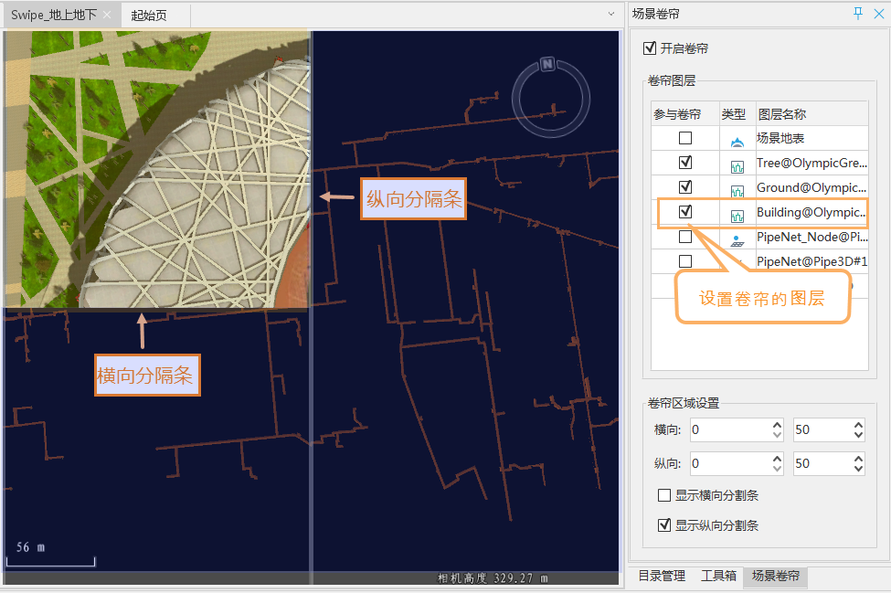 “场景卷帘”功能,通过对指定的图层设定卷帘区域,以达到对比查看同一区域不同时期或者地上地下的场景浏览效果。