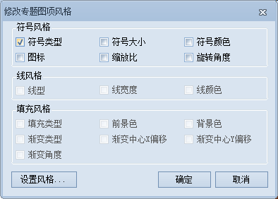 - 在专题列表中选中多项专题值(可配合使用 Ctrl 或 Shift 键),单击"工具条"中符号风格按钮时,弹出"修改专题图项风格"对话框,如下图所示: