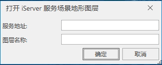 - 弹出“打开 iServer 服务场景地形图层”对话框,输入你所发布的 iServer 服务场景中的地形数据的地址和名称,然后单击对话框中的“确定”按钮即可打开该地形数据。