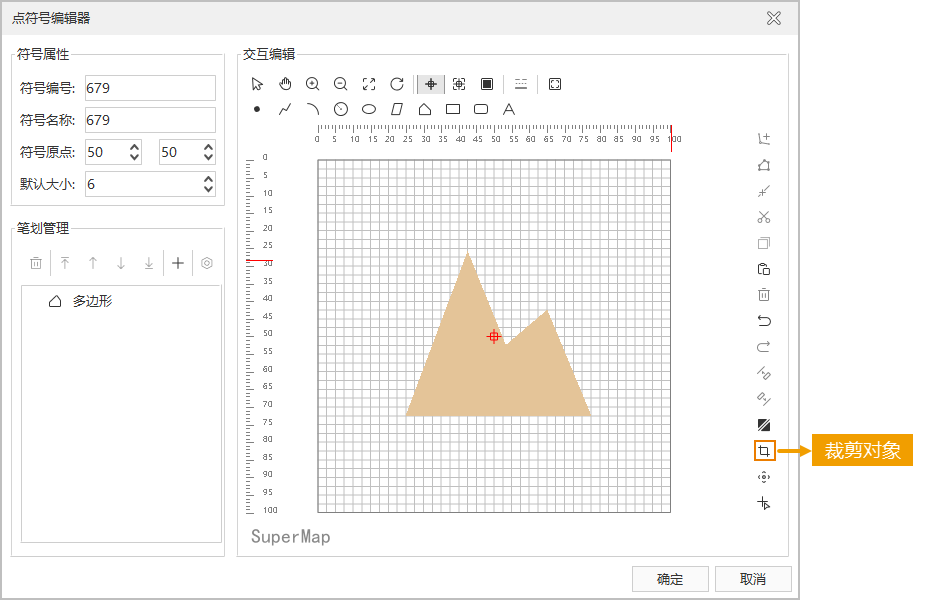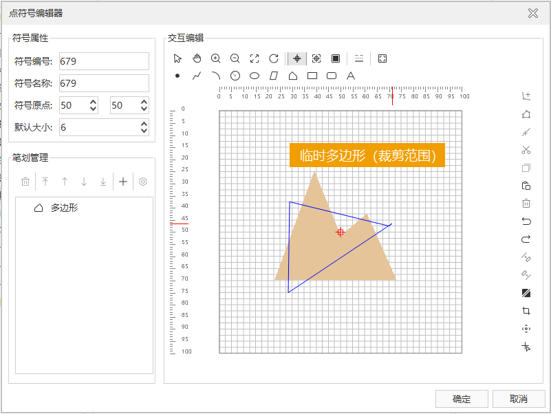 - 在符号编辑区域,通过连续单击鼠标,确定裁剪范围边界控制点,即绘制临时多边形,单击鼠标右键结束绘制,同时完成裁剪操作。