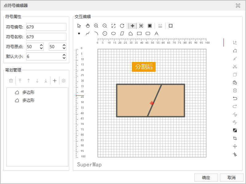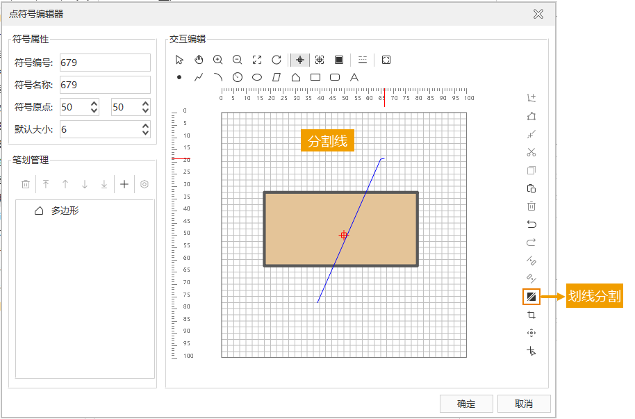 - 在符号编辑区域,通过连续单击鼠标,确定分割线上的控制点,即绘制临时折线,单击鼠标右键结束绘制,同时对折线所经过的几何对象进行分割。