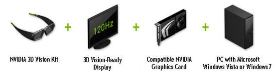 NVIDIA(英伟达)提供的这两套方案由于对显示器和眼镜的要求比较高,在硬件上成本较高,均由3D立体幻境套装、3D Vision-Ready显示器、显卡和PC机构成,如下图所示。但3D Vision Surround需要2台及以上120Hz以上的显示器或者投影仪,所呈现出来的的3D立体效果是环绕式的,因此在成本上高于3D Vision。