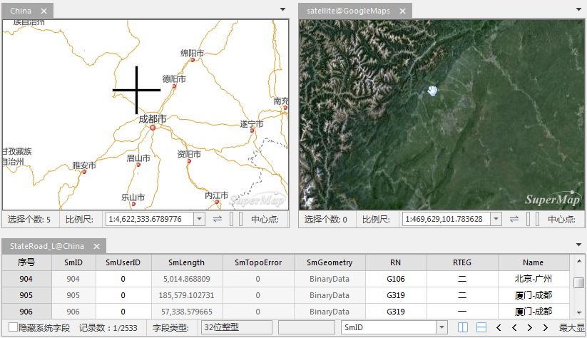- 接下来,就可以在其中一个地图窗口中进行漫游、缩放等浏览操作,另一个窗口也将随之进行联动。当关联属性表浏览时,双击属性表中某条记录,地图窗口会快速定位至该对象。特别强调,在对一个窗口中的对象进行编辑修改时,另外一个窗口中的对象也会发生相应的变化。