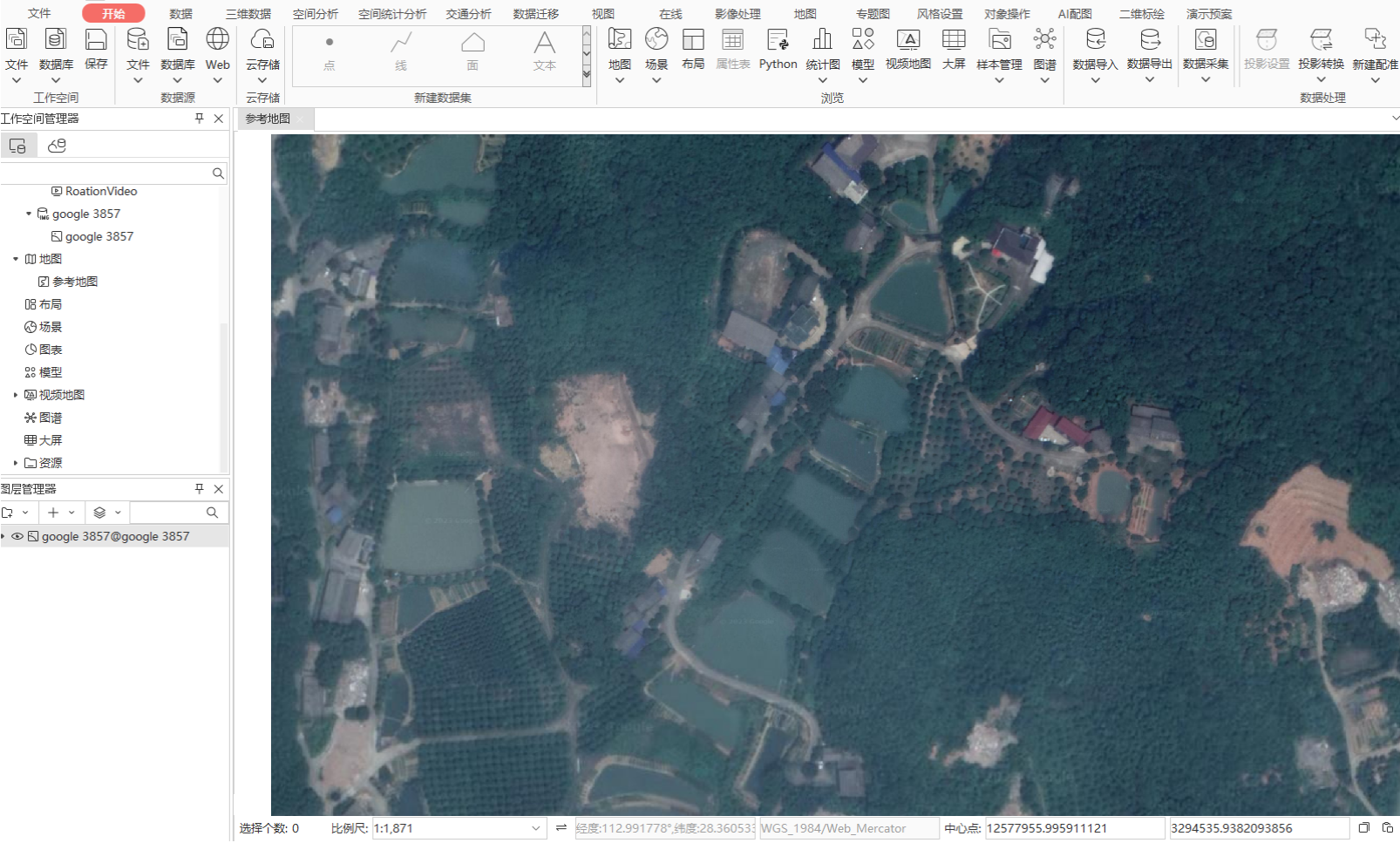 - Use web datasources: Navigate to Start tab → Datasource group → Web dropdown → Tianditu. In the Open Web Datasource dialog, select Global Image Map Service (Mercator), then add the img dataset to map. Locate the filming area and save the map.