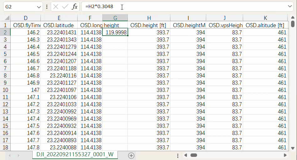 - Calculate Camera Altitude: Convert OSD.height [ft] to meters (1m=0.3048ft). Create "height" field with formula: height=OSD.height [ft]*0.3048
