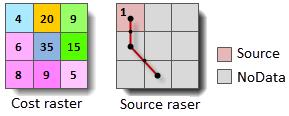 The cost raster defines unit movement costs through each cell, which could represent factors like elevation or slope. For example, crossing a mountain might offer shorter Euclidean distance but higher time cost compared to detouring.
