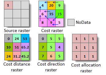 Cost Allocation Raster: Identifies the nearest source for each cell. Cell values correspond to the source's grid value (for raster sources) or SMID (for vector sources). NoData cells in the cost raster remain NoData in the output.