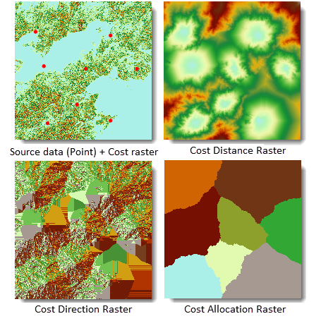 The example below demonstrates using a point dataset as source data and a reclassified slope raster as cost input. The outputs include cost distance, direction, and allocation rasters.