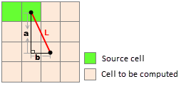 Line Distance Raster: Represents the distance from each cell to the nearest source, where the raster value equals the Euclidean distance between the current cell and the nearest source. The nearest source is the one with the minimum straight-line distance from the current cell to all sources. For each cell, the distance to a source is calculated by connecting their centers and using the Pythagorean theorem with the two orthogonal sides of the right triangle formed. Thus, Euclidean distance calculation depends only on cell size (resolution). The diagram below illustrates straight-line measurement, with source raster cell size set to 10.
