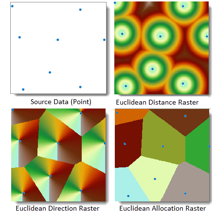 For example, using vector point data representing hospital locations, executing Euclidean distance generation produces three datasets: