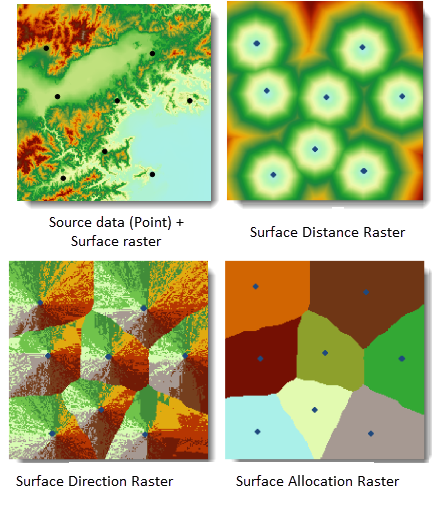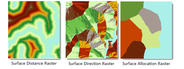 The Generate Surface Distance Raster function produces three output datasets: Surface Distance Raster, Surface Direction Raster, and Surface Allocation Raster based on source datasets and surface raster inputs.