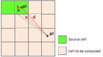 Surface Distance Raster: Represents the shortest surface distance from each cell to the nearest source across the surface raster. The nearest source is determined by the minimum surface distance among all possible sources. No-data cells in the surface raster remain as no-data in the output. The surface distance calculation between adjacent cells (g1 to g2) uses the following resampling method: