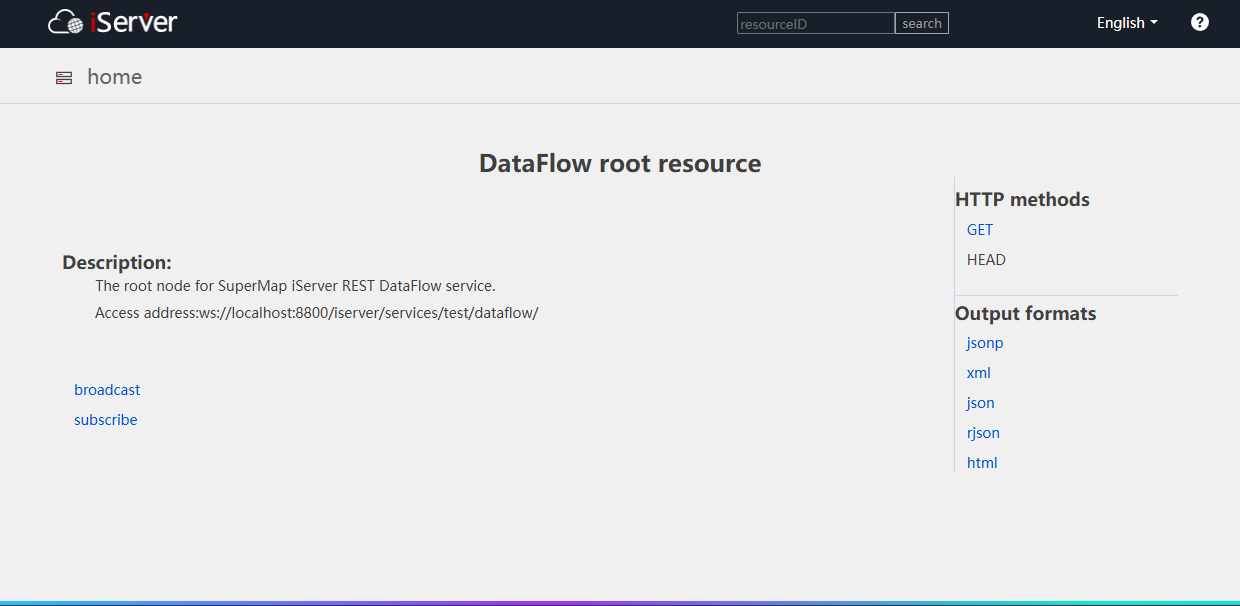 - Stream Data Service Root Resource: The page records the access address of the data stream and two jump links, broadcast and subscribe.