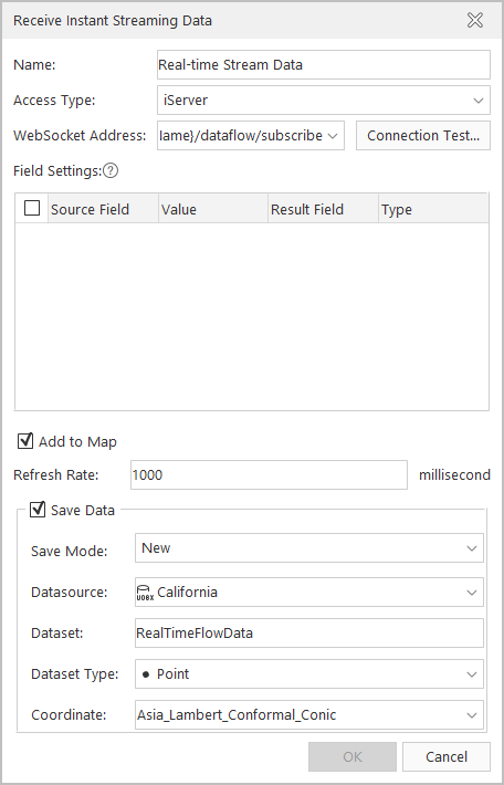 - WebSocket Address: The request address on the iServer's Subscribe page. After entering the address, click the "Connection Test..." button on the right, and a prompt “Service connection successful, waiting for data access!” will appear.
