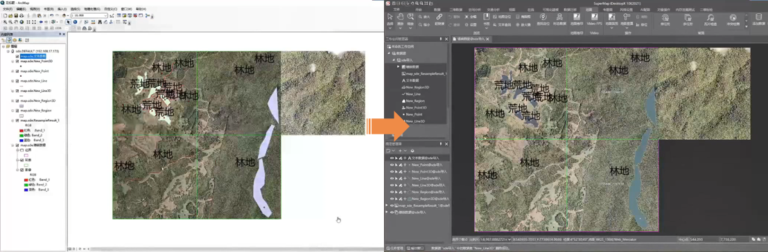 Import SDE database to a file-based datasource. The SDE database contains image, text, mosaic datasets, and vector datasets. The migration effect is shown below: