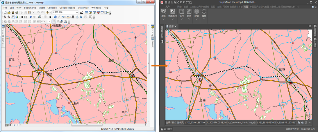 SuperMap iDesktopX supports migrating ArcGIS platform symbol information. It allows batch conversion of ArcGIS symbol library files (*.style format) into SuperMap symbol library files, including point symbol library (*.sym), line symbol library (*.lsl), and fill symbol library (*.bru). This provides an efficient and fast way to migrate symbol styles for quick style configuration.