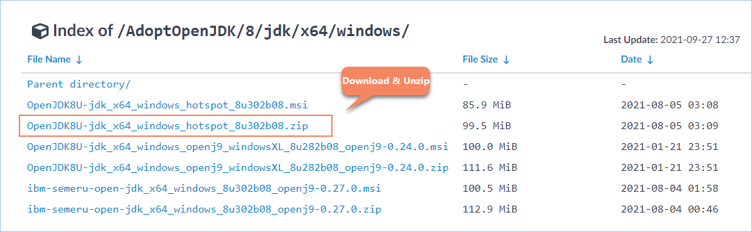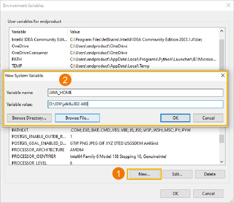 - Create a JAVA_HOME variable with the value %JDK installation path%, e.g.: If JDK is extracted to "D:\jdk\jdk8u302-b08", configure as shown:
