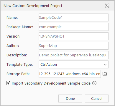 Note: Checking "Import Secondary Development Sample Code" will load sample templates into the project, adding an "Example Code" tab when launched.