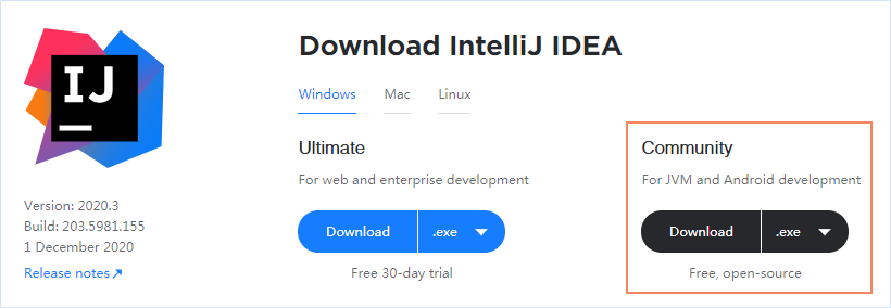 We recommend using IDEA 2020.2.2 or newer versions as the development tool. Download the Community Edition from the IDEA official website, then double-click the *.exe file in the installation package to install.