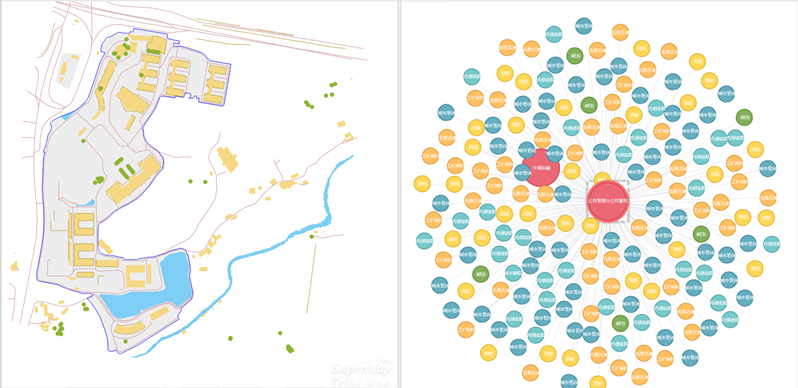 SuperMap iDesktopX supports linked views between knowledge graphs and maps. When selecting an object on the map, the corresponding node will be highlighted in the graph window. If no related node exists in the graph, the output window will display: the object corresponding to the map was not found in the target graph.