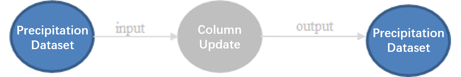 Saving GPA data lineage to graph databases means representing GPA tools, datasets and attributes as graph entities, while data processing flows as graph relationships. As shown below, input data (precipitation dataset) undergoes column update processing to generate new precipitation data, with graph nodes representing input/output data and GPA tools, connected by input/output relationships.