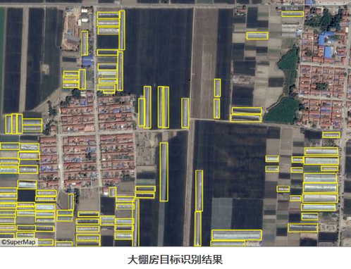 The following figure illustrates the Object Detection result of greenhouses in a specific area. The yellow bounding boxes indicate detected greenhouses, which can efficiently and accurately identify their spatial distribution, locations, and quantities, providing foundational data support for greenhouse management and cultivated land regulation.