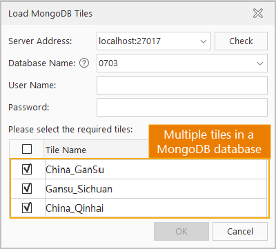 - After successful connection, all tiles in the database will be listed. Select desired tiles for loading.