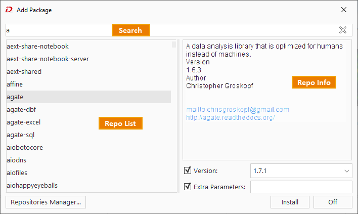 Click Add to open the package installation dialog. Search or browse for required packages, view their descriptions, versions, and publishers.