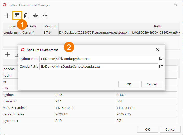 In the Python Environment Manager dialog, click Add Existing Environment. Provide paths to Python.exe and conda.exe in the pop-up dialog, then click OK to add the specified environment.