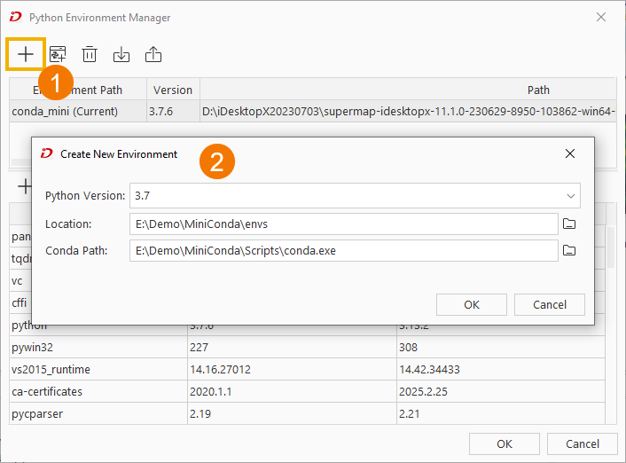 Python offers a vast array of dependency packages for use. To simplify Python environment and dependency management in SuperMap iDesktopX, we have integrated the Conda package management system. This allows users to easily install/update dependencies and create/manage Python environments through visual interfaces.