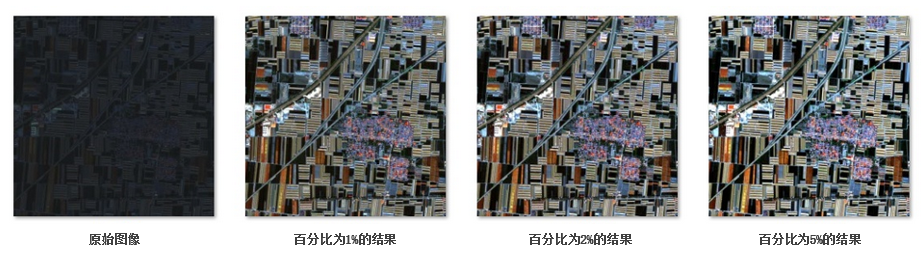 For example, if most of the data is distributed between 20-100 and only a small portion is distributed at the extremes, we can use the percentage clip stretch method with a specified percentage of 2%. We find the grayscale values corresponding to the 2% and 98% percentages, and use these two values as the minimum and maximum values for the original image grayscale. Then we perform linear stretching. The values within the lowest 2% range are directly set to the minimum output value, and the values within the highest 2% range are directly set to the maximum output value. This adjusts the data between 20-100 to the range of 0-255, increasing the contrast of the image. The result returned is a raster dataset (RasterRDD).