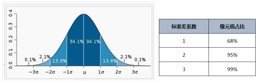 As shown in the figure below, a pixel value within one standard deviation coefficient accounts for 68%, within two standard deviations accounts for 95%, and within three standard deviations accounts for 99%. If the standard deviation coefficient is defined as 2, pixel values exceeding 2 standard deviations will be pushed to the positions of 0 or 255. Pixel values between two standard deviations are linearly stretched to fit within the range of 0-255. Standard deviation stretch is often used to brighten raster datasets with darker tones.