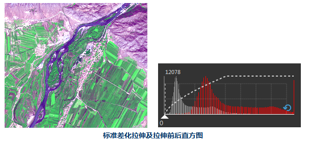 The histogram below vividly illustrates the process of standard deviation stretch. The left image shows the effect of applying standard deviation stretch on an image, while the right image shows the before and after comparison of the histograms. It can be observed that after stretch, the histogram of the image conforms to the shape of a normal distribution curve, and the standard deviation of the stretched image increases, indicating a decrease in the deviation between the pixel values and the average value.