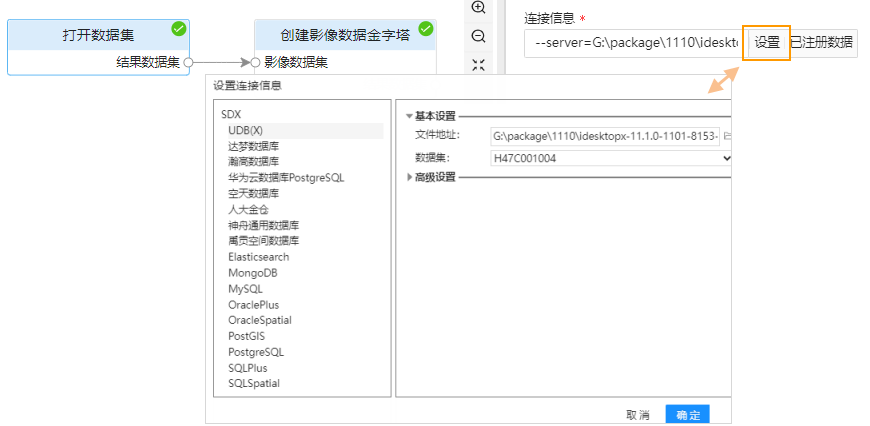 | Connection Info | Connection Info of the Dataset to be opened, the parameter is a Connection Info string, including: Datasource Type, Information such as Dataset Name. Set by using '--key = value'. Multiple values are separated by a ' ' space. For example: 1. Open the Dataset in the local UDBXFile Database: --server=G:\package\1110\idesktopx-11.1.0-1101-8153-98159\test3.udbx --dataset=H47C001004 --dbType=udbx --providerType=sdx 2. Open Dataset in PostGISDatabase-type Datasource: --server=172.16.120.35:5432 --database=TEST --user=TEST --password=●●●●●● --alias=TEST --dataset=TEST --maxConnPoolNum=10 --dbType=PGGIS --providerType=sdx in iServer's Geo-Processing Automation (GPA) WebUI interface and iDesktop XGeo-Processing Automation In the (GPA) modeling interface, the parameter provides a UI interface. You do not need to write the above complex strings. You only need to fill in the necessary information in the "Setting Connection Info" dialog box to automatically generate the string content of the parameter. In the Geo-Processing Automation (GPA) WebUI interface of iServer as shown in the figure below, click the "Settings" button on the right side of this parameter to open the dialog box. ![]() |