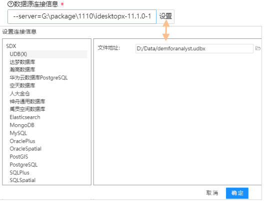 | Datasource Connection Info | Connection Info of the Datasource to be opened. This parameter is a Connection Info string. Contains: Datasource Type, name and other information. Set by using '--key = value'. Multiple values are separated by a '' space. For example: 1. Open the local UDBXFile Database --server=G:\package\1110\idesktopx-11.1.0-1101-8153-98159\test3.udbx --dbType=udbx --providerType=sdx 2. Open PostGISDatabase-type Datasource:--server=172.16.120.35:5432 --database=TEST --user=TEST --password=●●●●●● --alias=TEST --maxConnPoolNum=10 --dbType=PGGIS --providerType=sdx in iServer's Geo-Processing Automation (GPA) WebUI interface and iDesktop XGeo-Processing Automation In the (GPA) modeling interface, the parameter provides a UI interface. You do not need to write the above complex strings. You only need to fill in the necessary information in the "Setting Connection Info" dialog box to automatically generate the string content of the parameter. In the Geo-Processing Automation (GPA) WebUI interface of iServer as shown in the figure below, click the "Settings" button on the right side of this parameter to open the dialog box. ![]() |