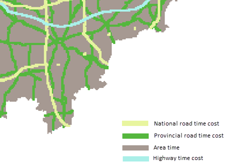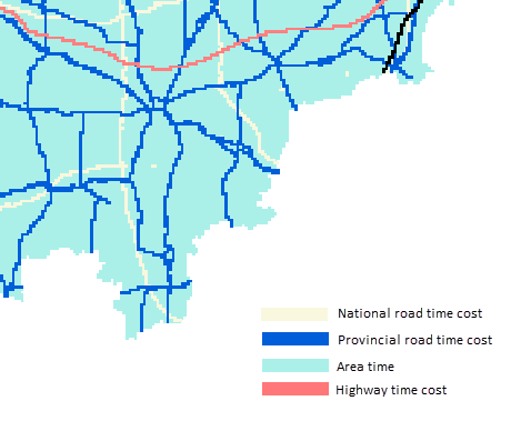 The raster mosaic tool can be used to obtain minimum travel time cost raster for a region. Prepare raster data containing unit-length travel times for national highways, provincial roads, regional areas, and high-speed rail.