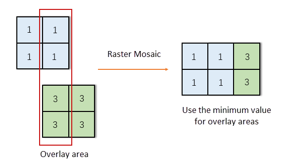 As shown in the figure above, two raster datasets are mosaicked using the same geographic coordinate system. For overlapping areas, the result takes the minimum value from all datasets.